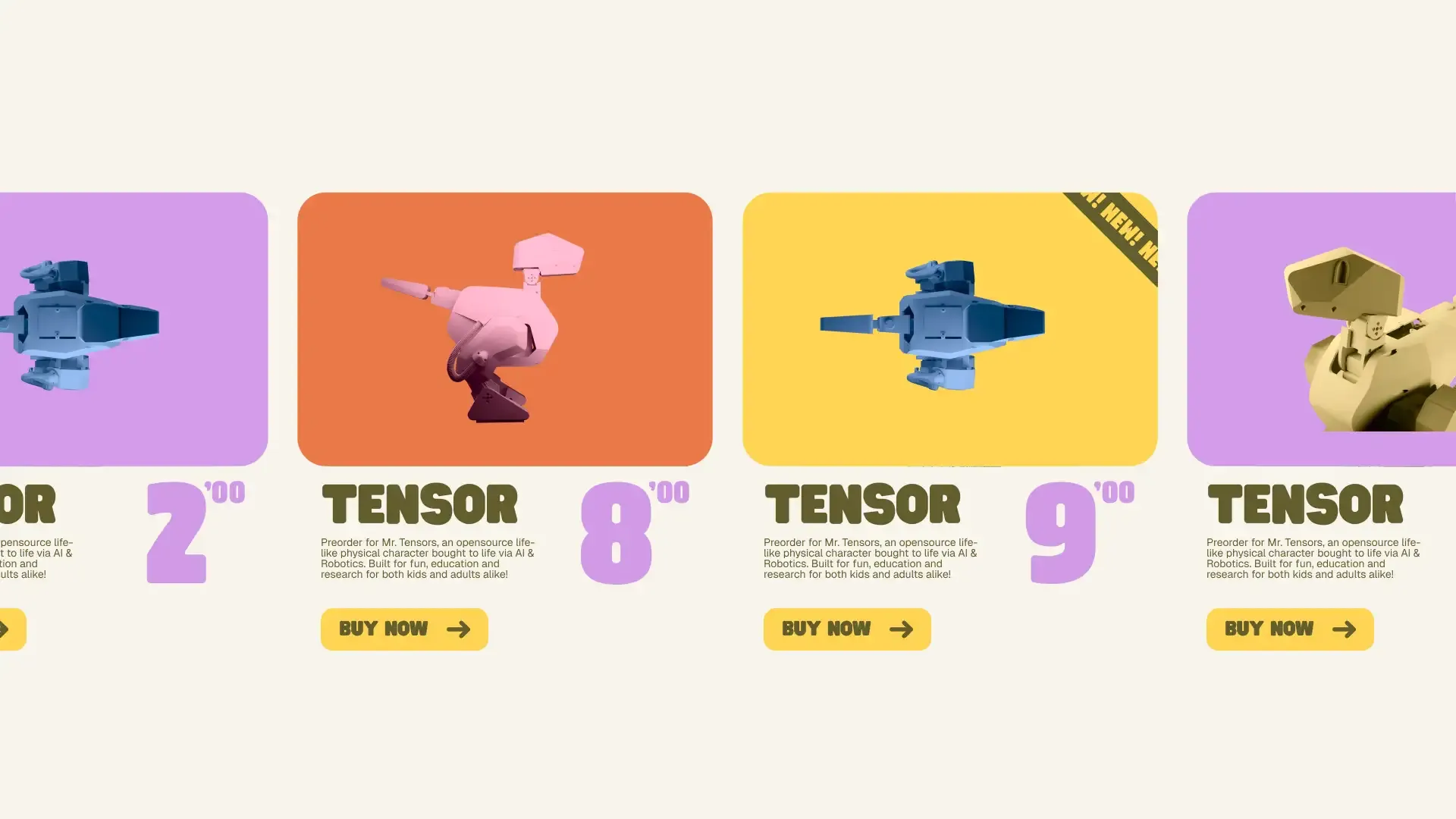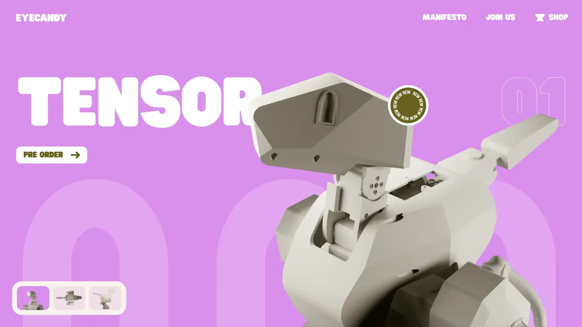 The design uses very playful colors and shapes, including colorful stickers with geometric forms. The website is an immersive 3D experience allowing users to view the robot from all angles, helping potential buyers understand the product.
